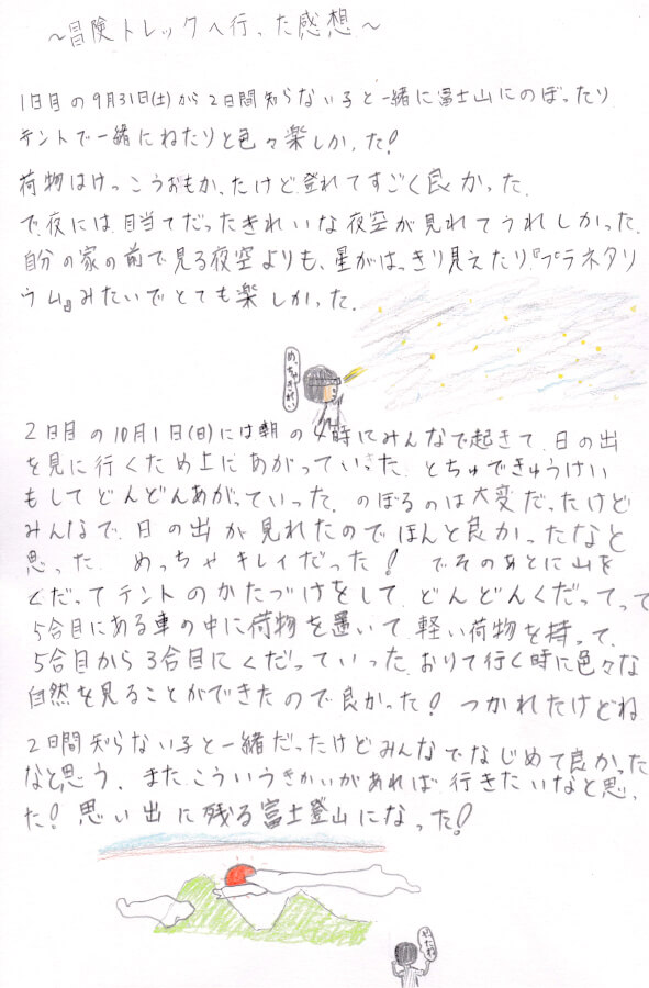 初めての富士登山、トレッキングシューズも初めて、大きな荷物を背負って行くのも初めて。 こんな小さな体で登る事が出来るのかと、本人よりもドキドキしていました。(保護者さまの声より)