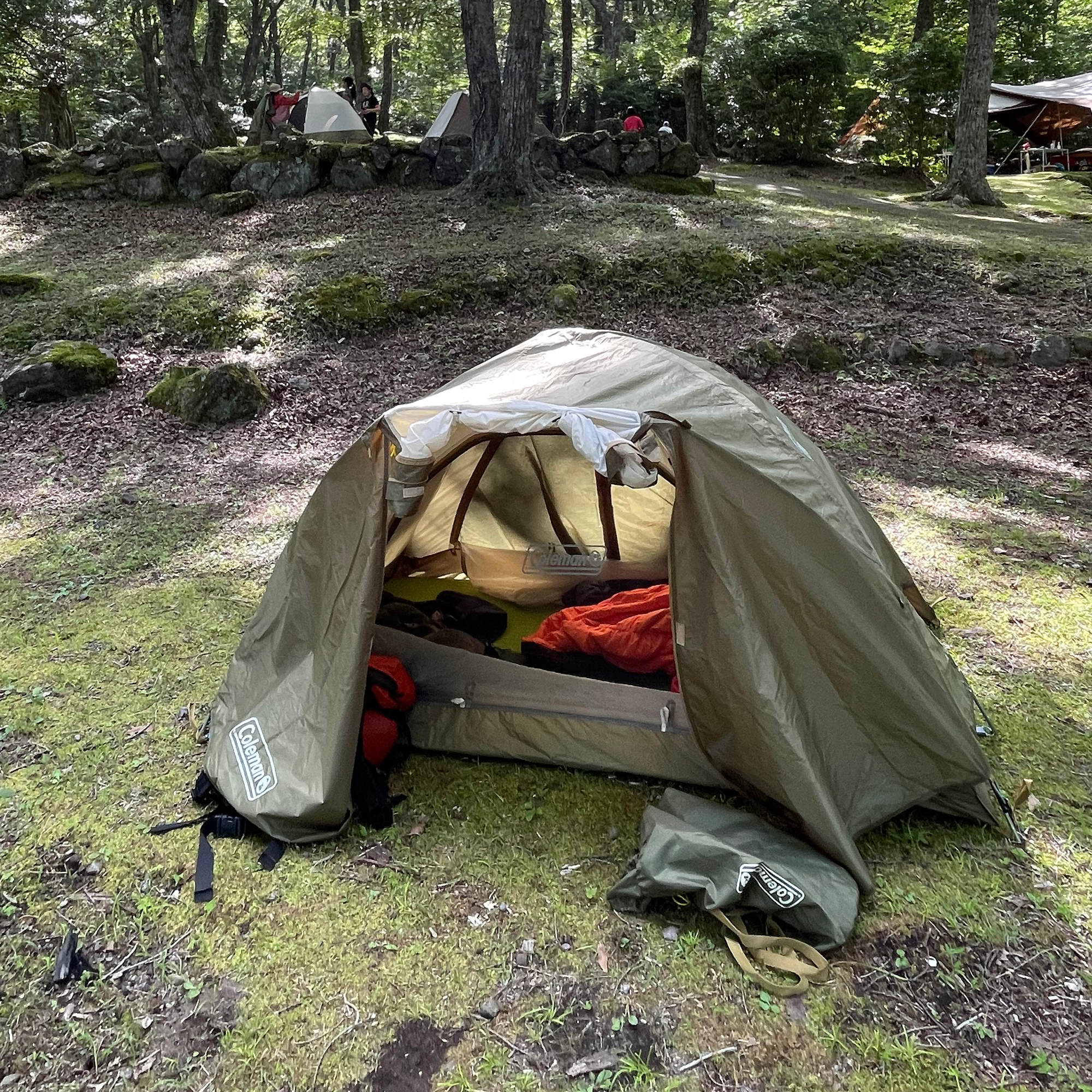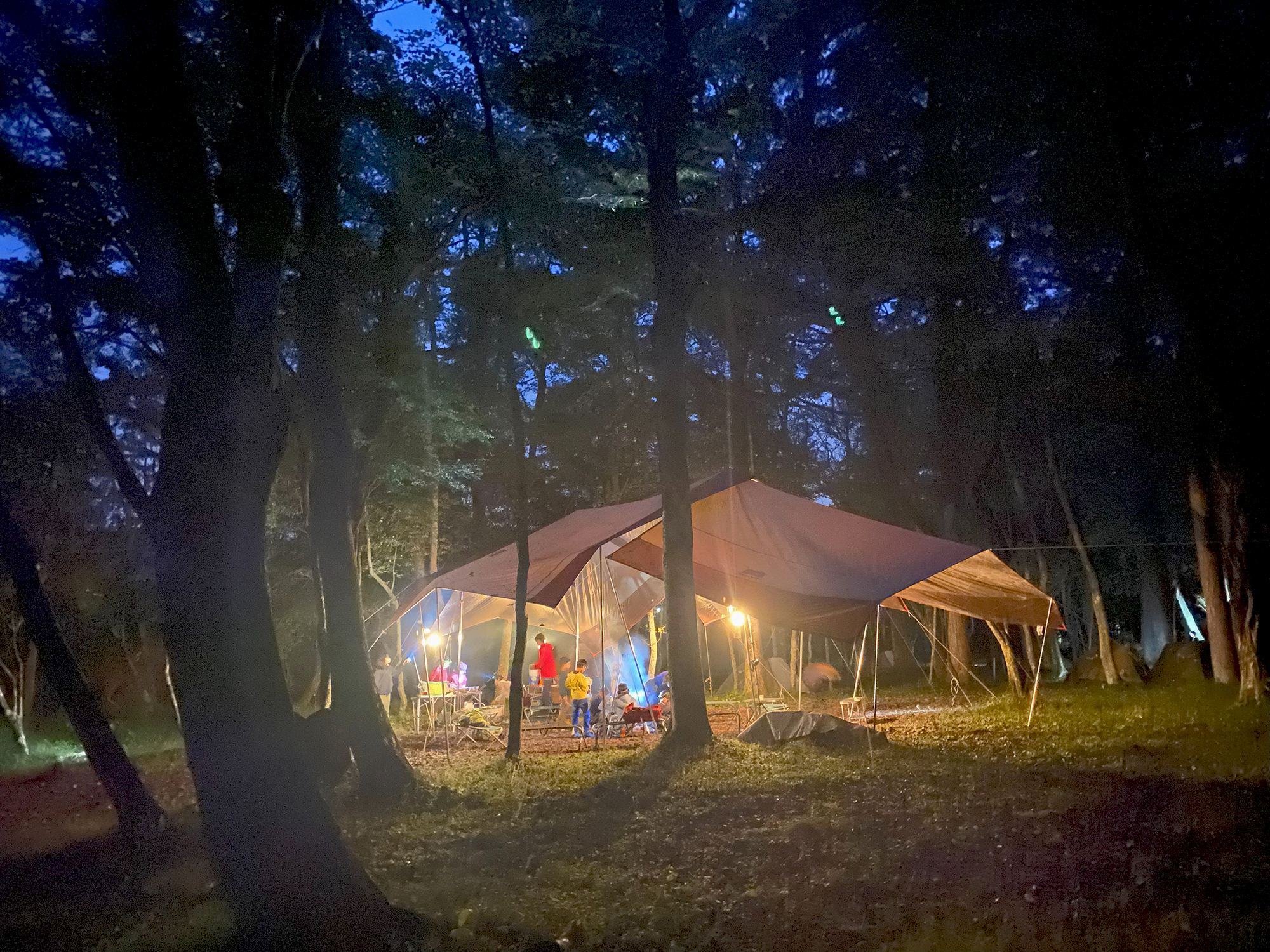 山中湖湖畔の静かな森にコールマンの宇宙船タープを設営。