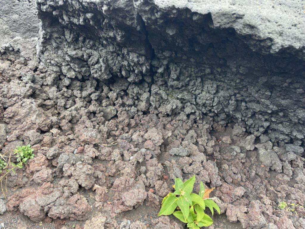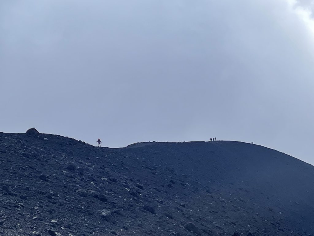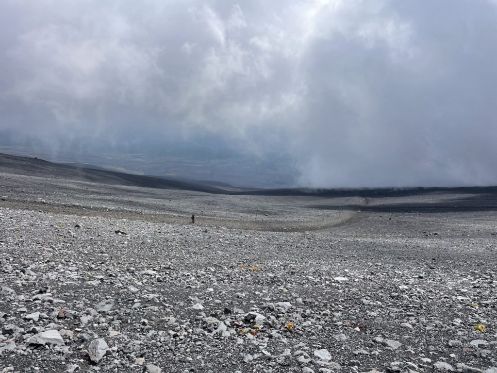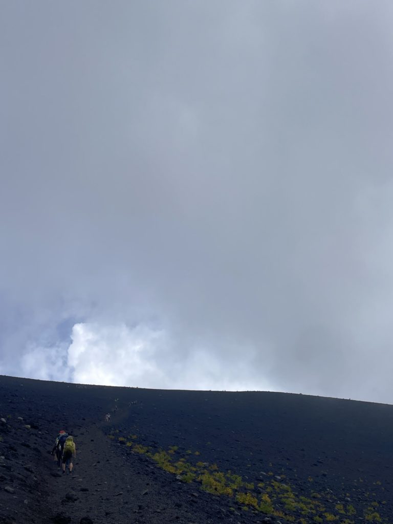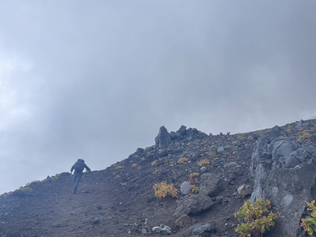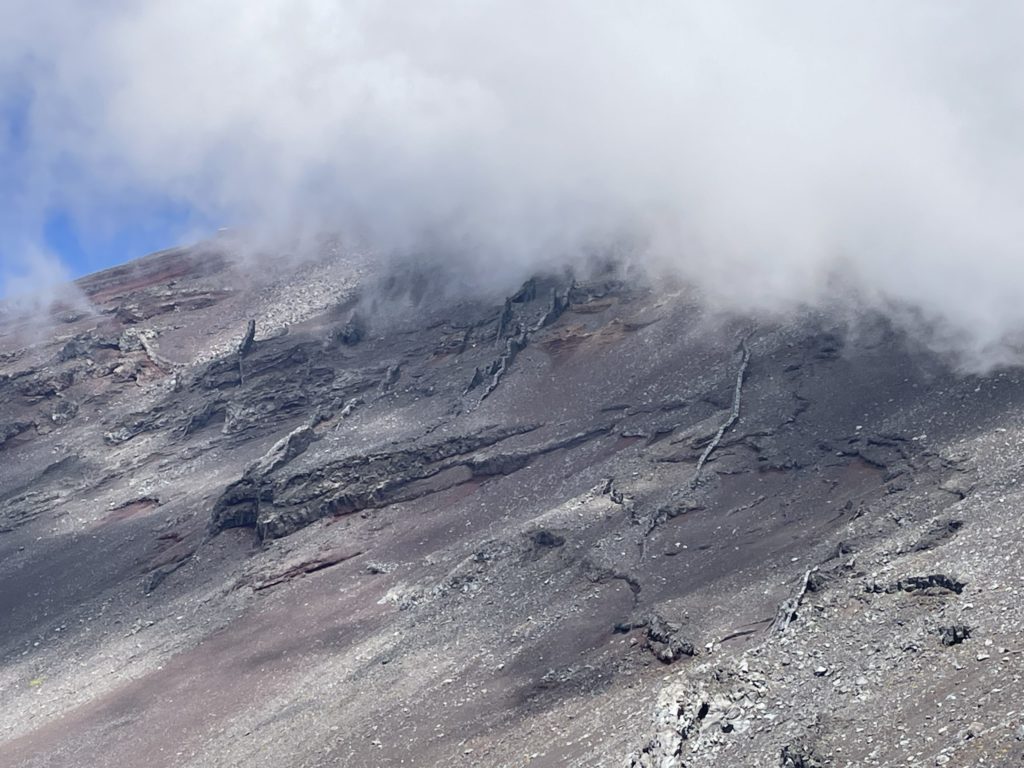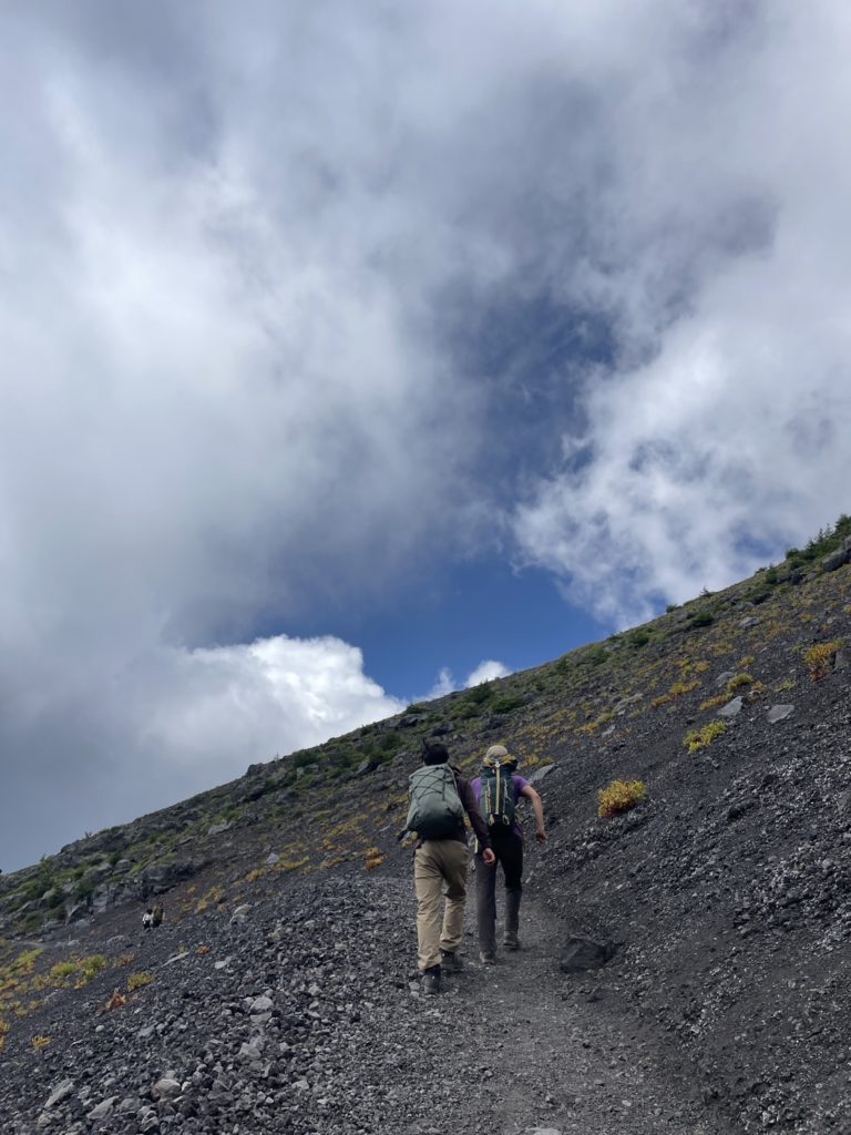 火山の砂地に足をとられて登り難い登山道。一歩一歩、足に荷重して身体を上へ上へと運んでいく山登り。