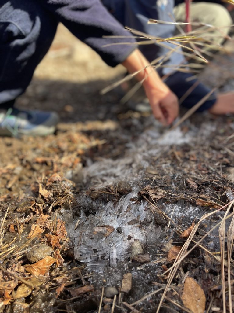 そっーと手のひらに霜柱をのせてみました。しばらくして「冷たいっ! 」と溶けてきた霜柱を放りました。