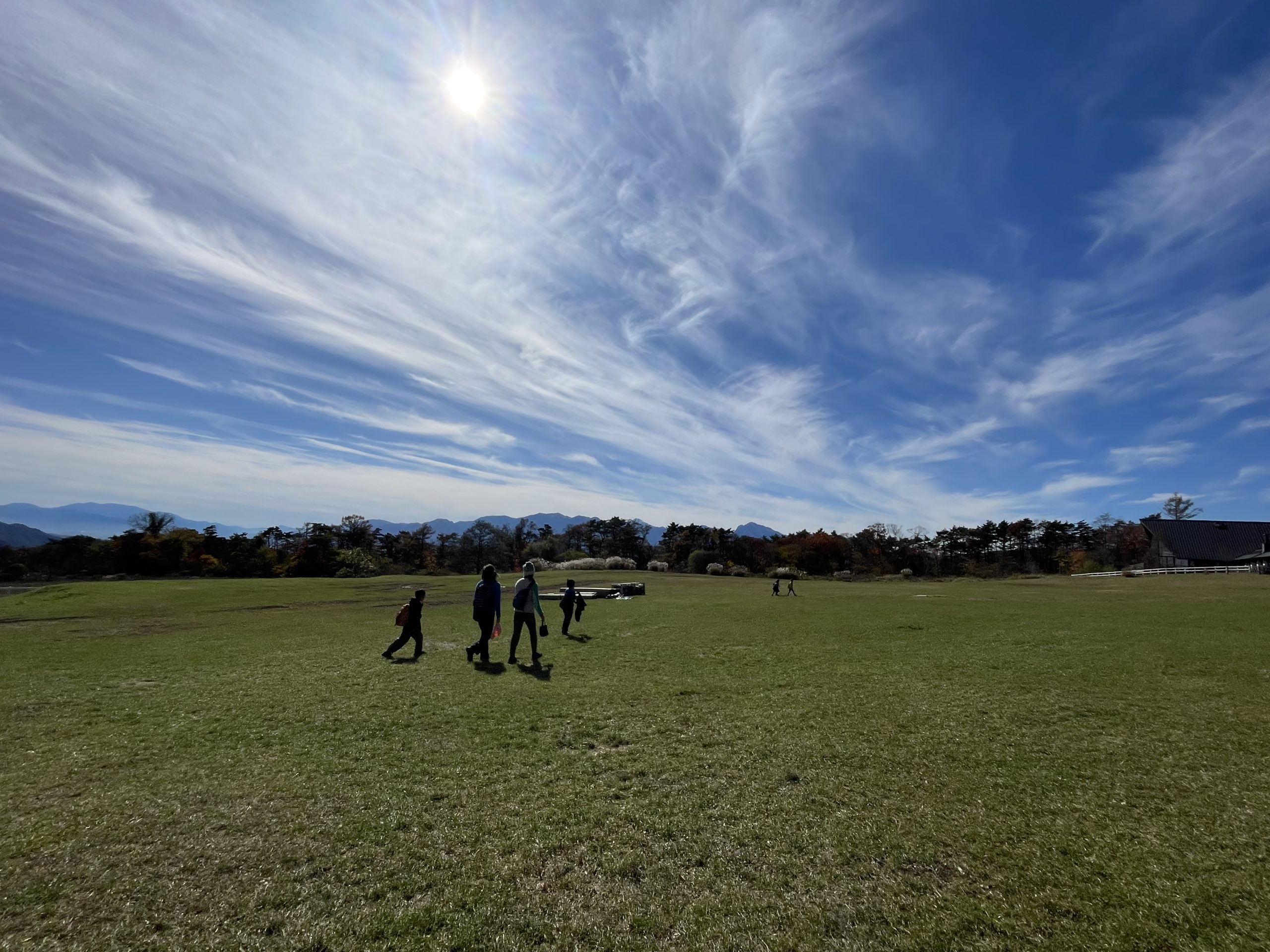 清泉寮の広場で鬼ごっこ。子鹿たち、青空の下で走り回っています。
