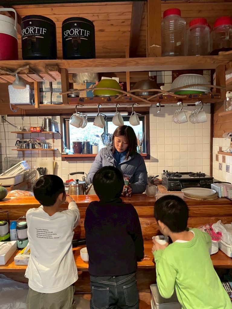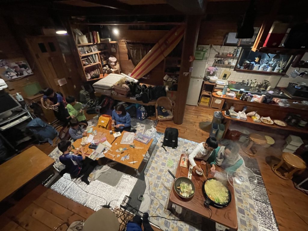 温泉から戻り、夕食の焼きそばを作る人と工作をする人、ギターを習う人。
