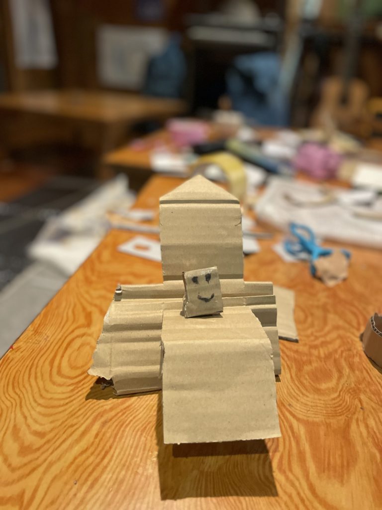 ダンボール工作。椅子にちょっこん! にっこり、かわいいなー。