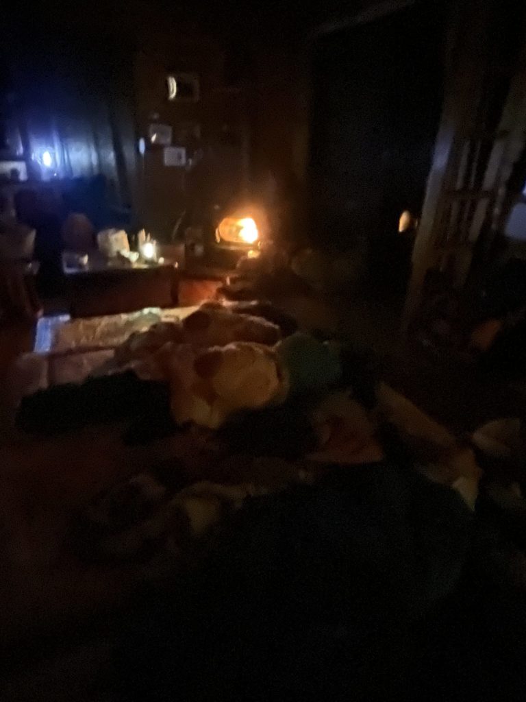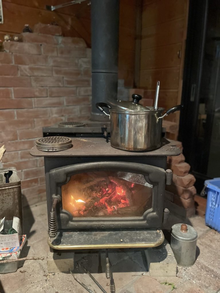 「寒いから、ストーブつけよう! 」暖炉の炎が消えかかると、誰かが薪をくべてくれました。