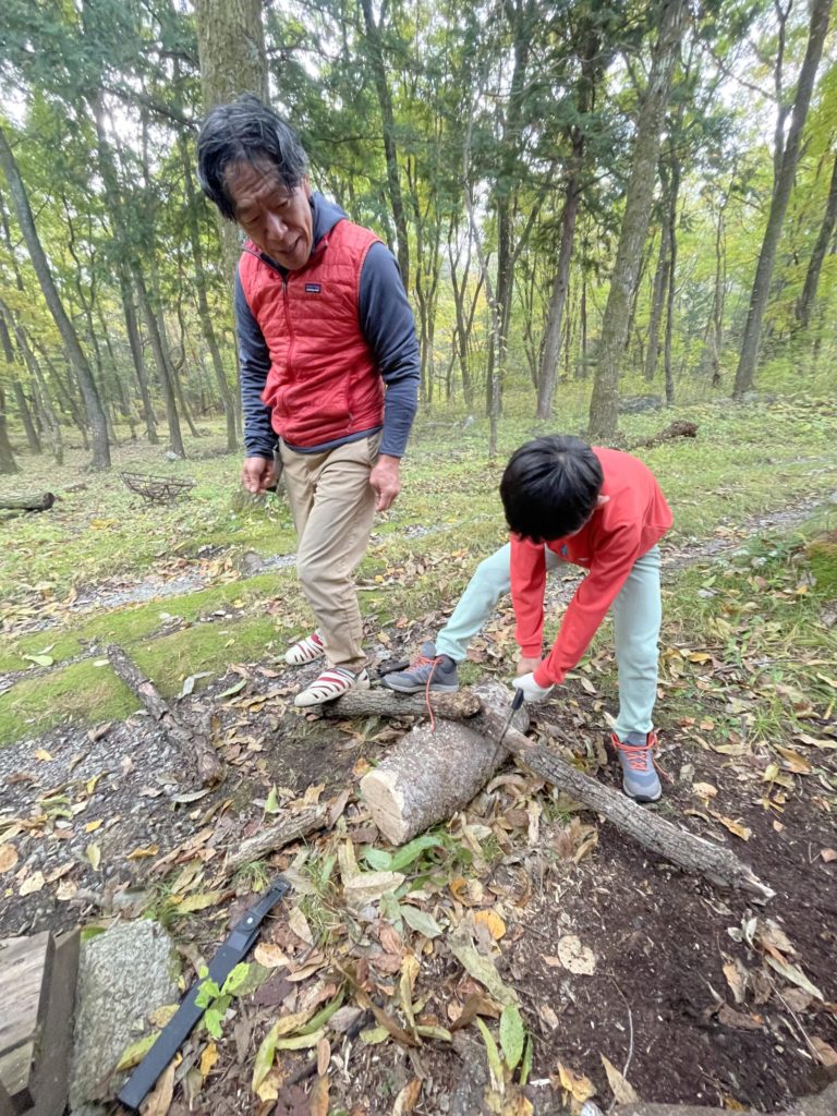 マサと森を歩いて、枯れ木を探し、暖炉に入る大きさに揃えて切っていきます。