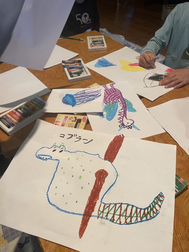 想像の生き物を描いて、その生き物の特徴を話して、みんな爆笑したり楽しいひと時を過ごしました。