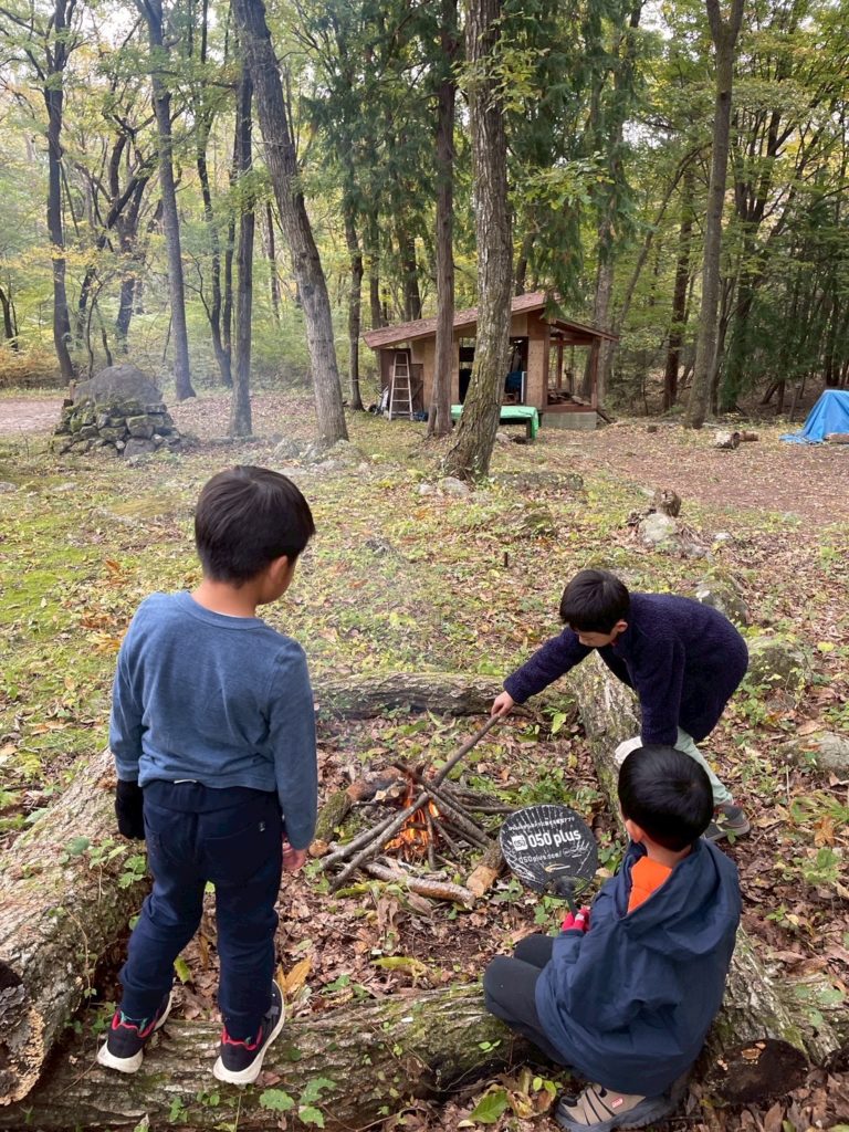 森に到着して、すぐに倒木を拾い! 一生懸命に薪を作ってくれました。暖かな炎が燃えています。