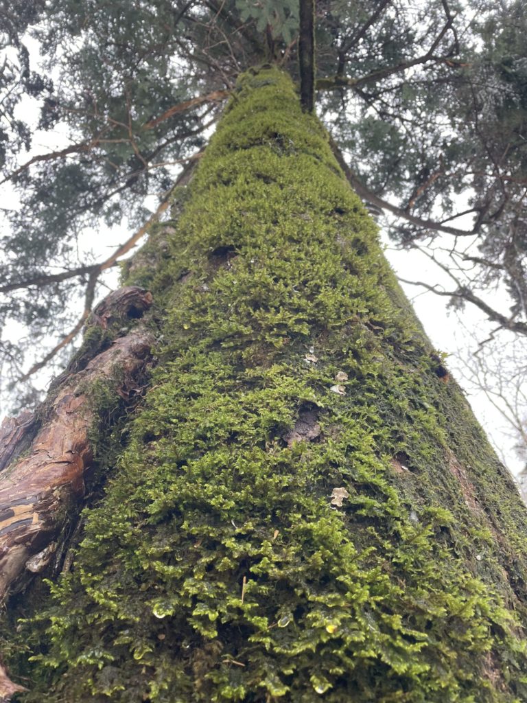枝から雪が落ちてきて、ヘルメットに当たります。雨に濡れた樹木たちはビロードの潤い。