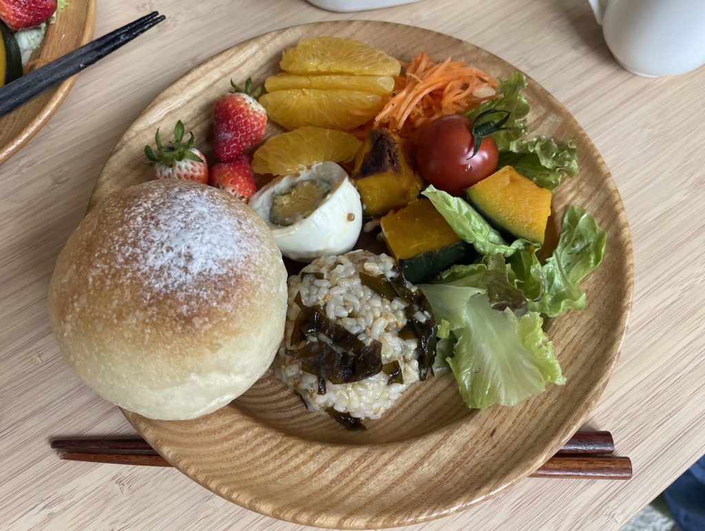 差し入れのフルーツを盛り付けて、粗食だけれど愛いっぱいのランチプレート。